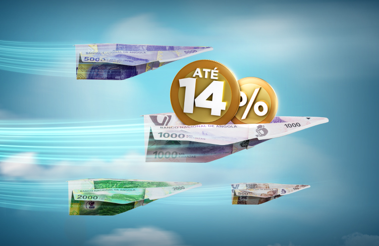 Com uma taxa de juro atractiva de 14% TANB*, um montante mínimo de Kz 250 000,00 e um prazo de 98 dias, o Depósito a Prazo Novo Impulso chegou para dar um impulso extra ao crescimento do teu dinheiro.